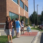Mike carelessly ignoring the high-voltage warning stickers on the side of the power box on the corner of our lot.